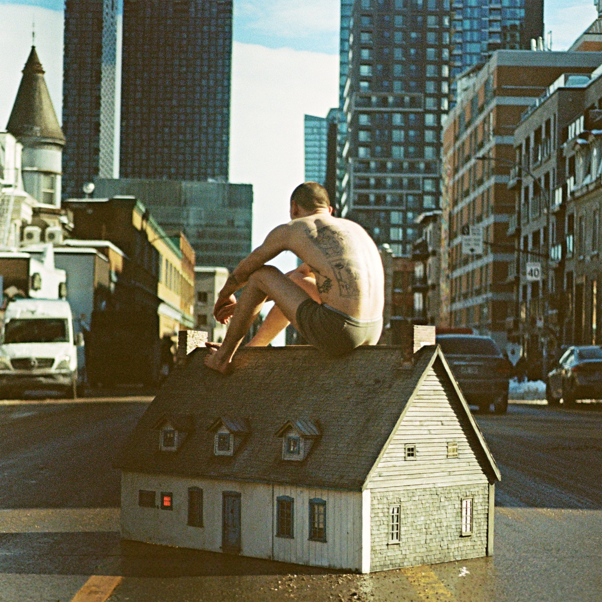 The album cover was shot on film by the band on Avenue du Parc in Montreal. A figure perches atop a small Quebecois-style house, handbuilt from reclaimed materials, spine curved, legs pulled in, bare-backed against a skyline that dwarfs everything beneath it. A rural thing dropped into the grit of the city, small and out of place and refusing to disappear. The body is naked and defenseless, open to every stimulus the world cares to deliver. This is the album in a single image.